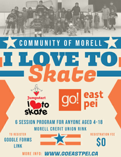 Morell Credit Union Rink 59 Queen Elizabeth Drive, Morell, Prince Edward Island, Canada*Exact day/time are TBD but I needed to pick a day to put on the website* The I Love to Skate program is funded by Jumpstart Canadian Tire and is an inclusive program for anyone between the ages of 4-18. This is a great opportunity for those that have been wanting to learn to skate…